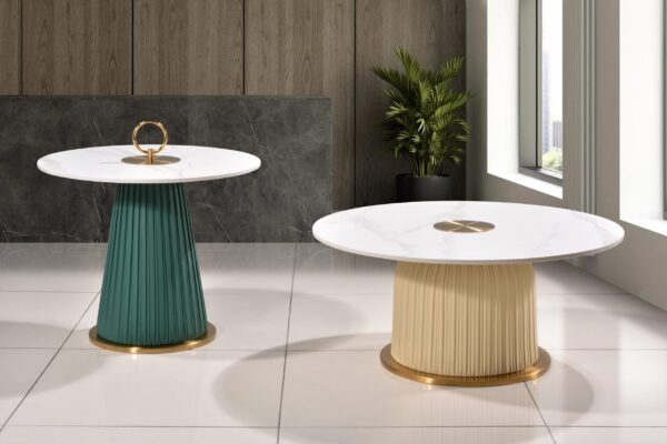 Material: SINTERED STONE TOP WITH MICROFIBER LEATHER AND GOLD STAINLESS STEEL BASE
