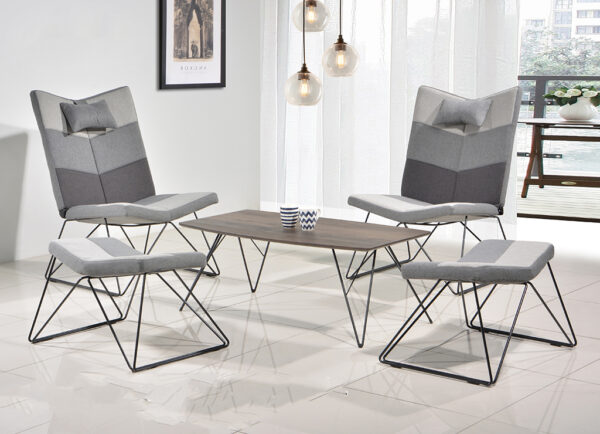 Material: RELAXING CHAIR AND FOOT STOOL WITH FABRIC CUSHION SEAT AND BLACK METAL LEG